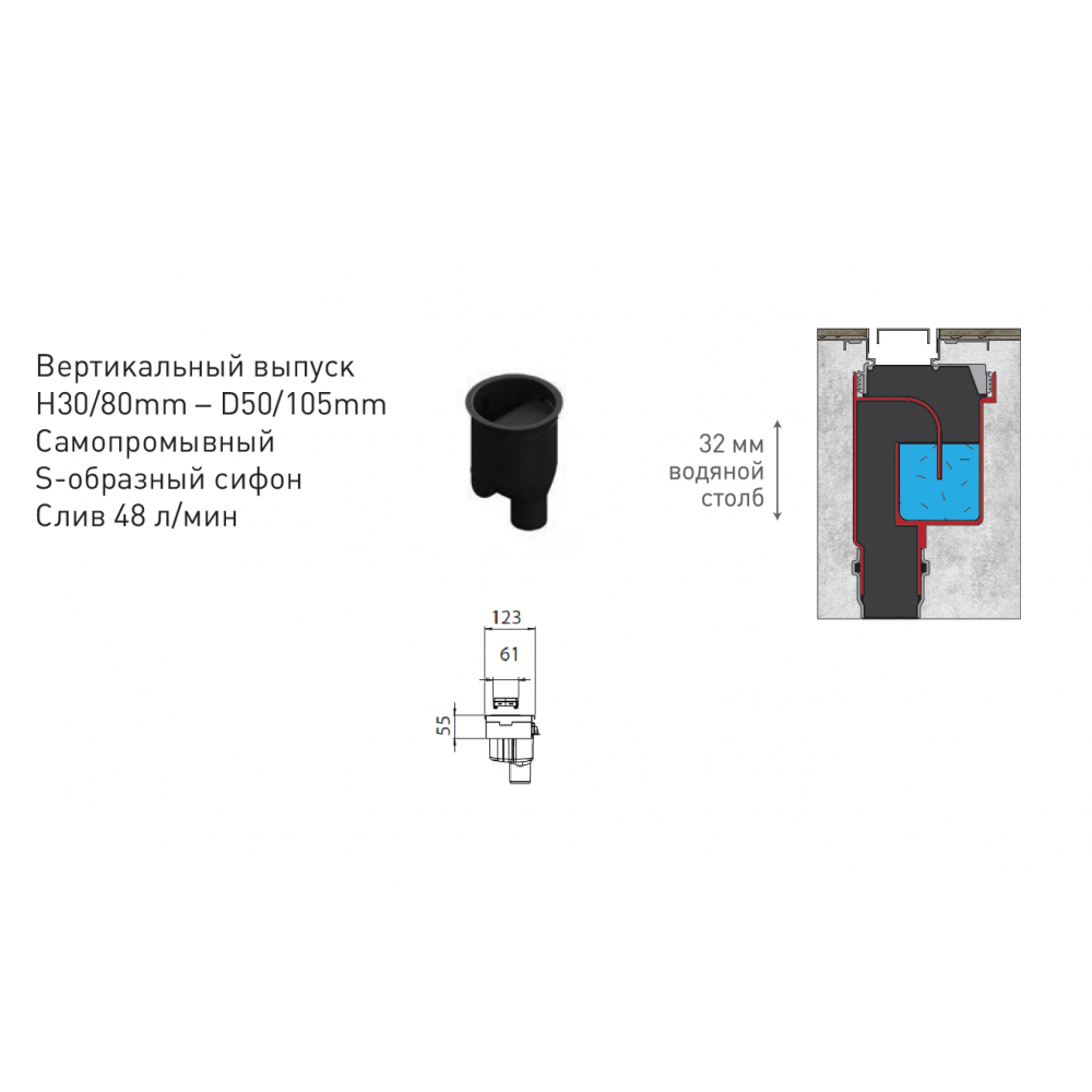 Вертикальный выпуск S-сифон D50/105мм H30/135мм, пропускная способность 42л/мин, монтаж 360°