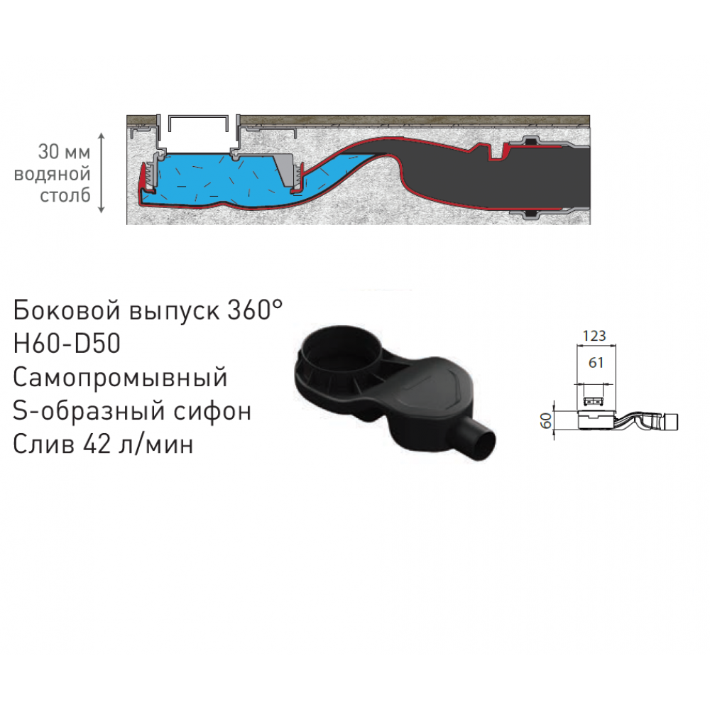 Горизонтальный выпуск D50 H60, пропускная способность 42л/мин, монтаж 360°