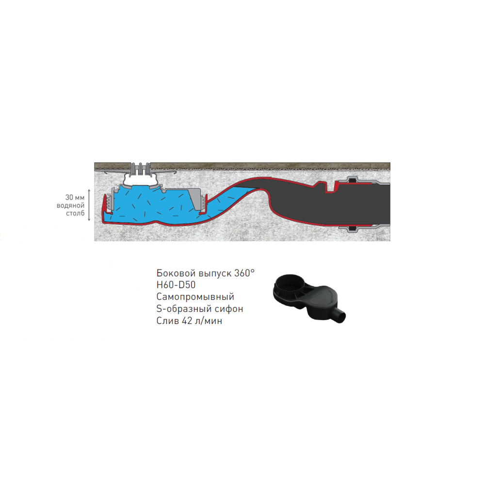 Горизонтальный выпуск D50 H60, пропускная способность 42л/мин, монтаж 360°