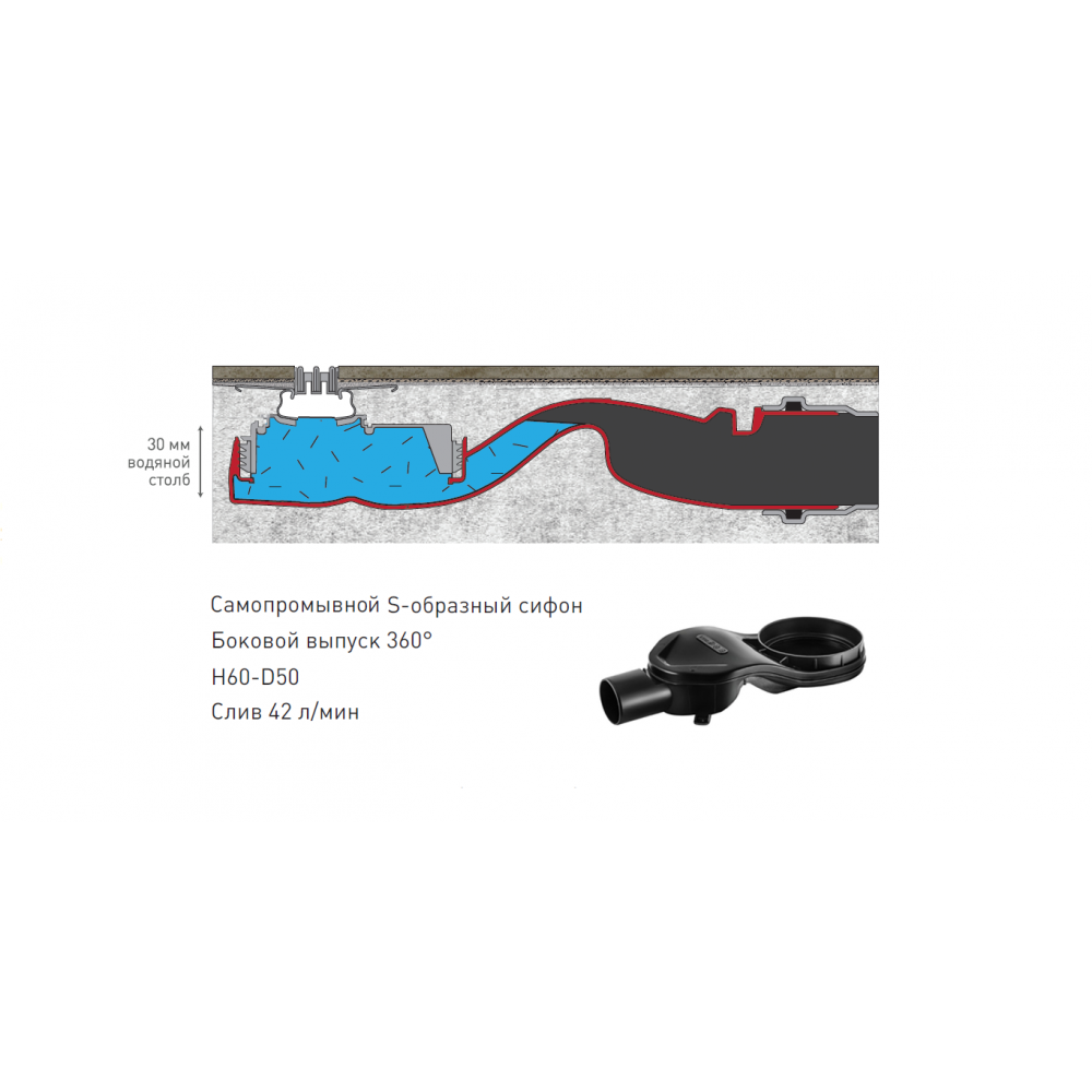 Горизонтальный выпуск D50 H60, пропускная способность 42л/мин, монтаж 360°