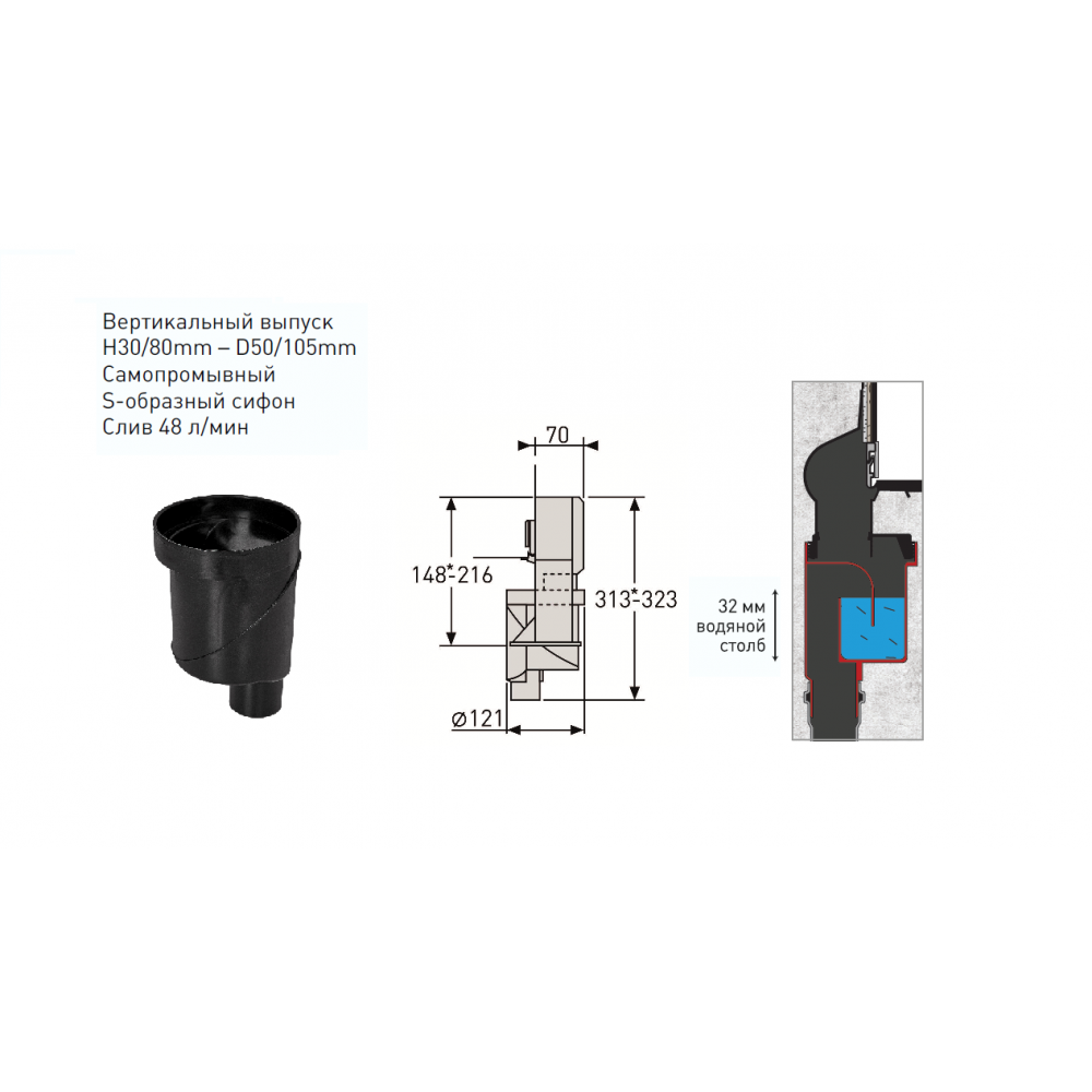 Вертикальный выпуск S-сифон D50/105мм H30/135мм, пропускная способность 42л/мин, монтаж 360°
