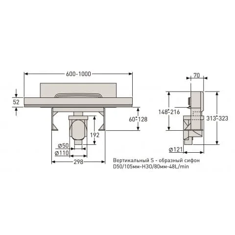 Горизонтальный выпуск D50 H60, пропускная способность 42л/мин, монтаж 360°