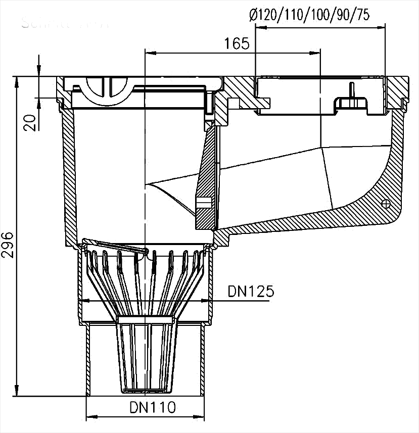 HL660G - дождеприемник с вертикальным выпуском DN110/125, с корпусом из ПП, с верхней частью из чугуна, и наборными кольцами из ПП под трубы наружных ливнестоков Ø75/90/100/110 мм, с листвоуловителем для предотвращения попадания в канализацию посторонних предметов, с незамерзающим запахозапирающим устройством, и лючком для прочистки.