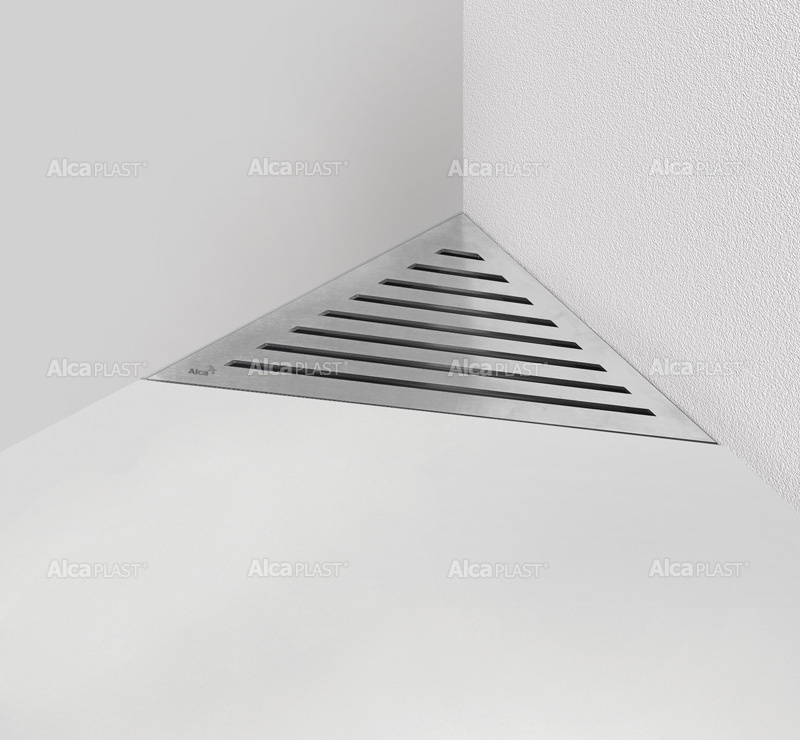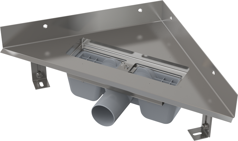 Желоб предназначен для установки исключительно в угол душевой, где стены имеют хорошую изоляцию. Вертикальный «воротник» обеспечивает простоту установки и превосходную изоляцию стен душевой. Желоб предназначен для установки массивных перфорированных решеток. Нержавеющий порог желоба образует визуальный переход между плиткой и вставленной решеткой. Вода протекает в желоб через края и отверстия желоба.